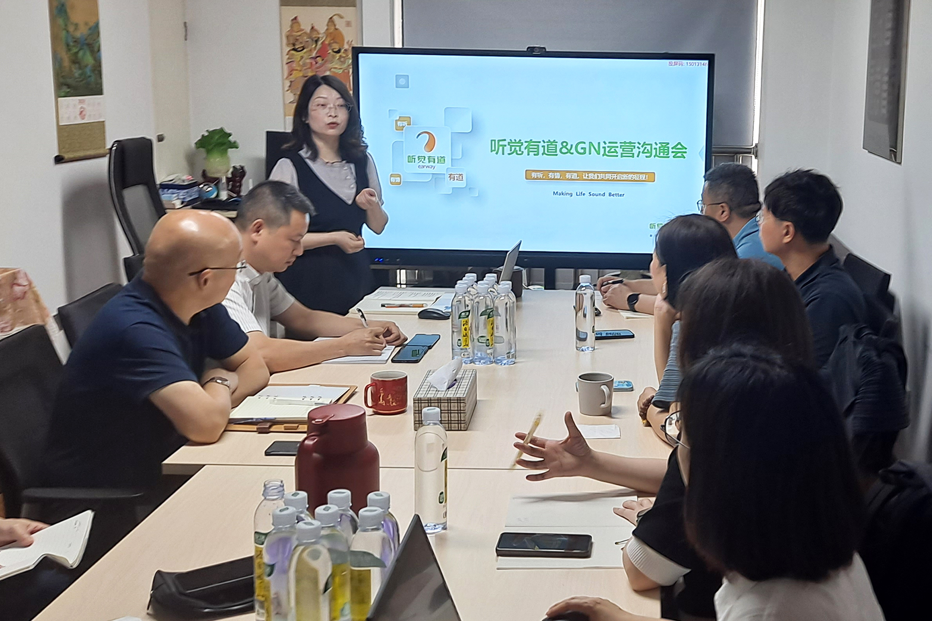 GN大北歐聽力中國區(qū)董事總經理孫曉沂率領銷售及培訓總監(jiān)陳敬、客戶服務部總監(jiān)張容艷、客戶服務高級主管周永樂、運營及項目部高級經理黃佳楠、售后服務經理陳海華、華西大區(qū)經理孫彥東、業(yè)務拓展部南區(qū)專員郭鳴一行八人到訪聽覺有道全國運營中心。